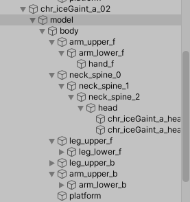 Let’s take a look at the the model structure. A model container game obejct contains the trunk, the trunk contains the limbs.
