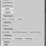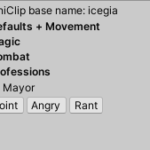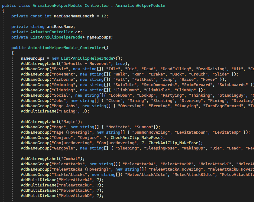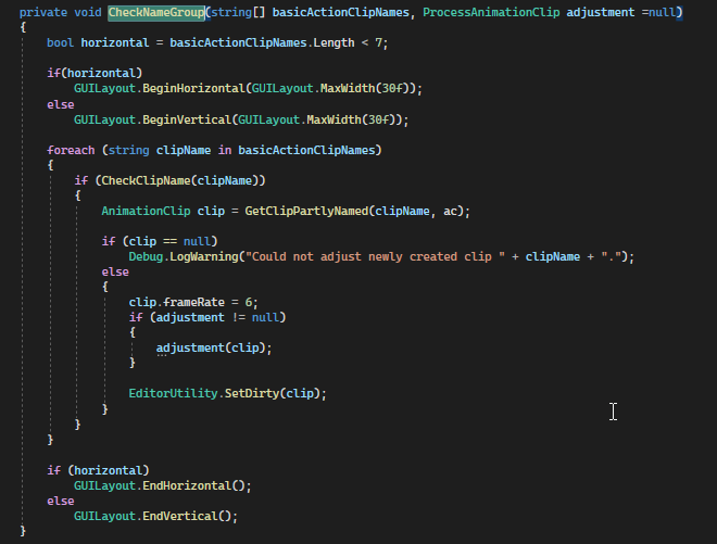 The options, that are grouped by categories, are traversed and presented only, if the related animation clip is not found. The method CheckClipName(clipName) draws the button for the clip only then, if the animation clip does not exist yet. An optional delegate ProcessAnimationClip can be specified to post-process the so created animation clip. I used that for poses, as you could see with the “Conjure” name groups above, where I passed the method CheckAniClip_MakePose, which internally slightly changes the AnimationClipSettings.