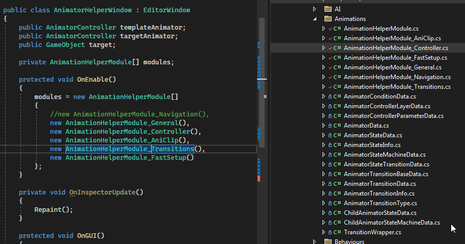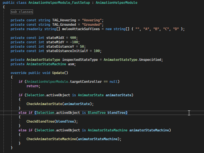 The modules shown in the picture above own an Update() method that draws the content only if it fits the current situation. E.g. Animator Controller layer setup options are only visible if the a layer is selected. The type of Selection.activeObject is therefore checked as below…