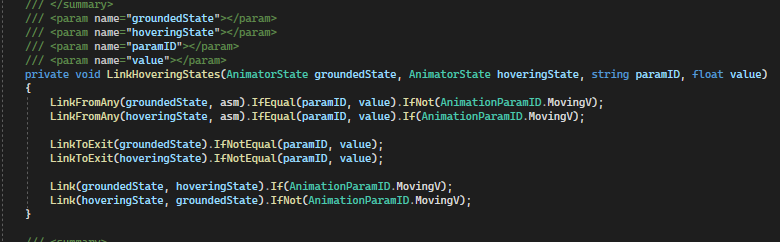 The logic I am linguistically proud of, is the generation of transitions within the process of generating animation state machines. By using the fluent interface pattern, the code looks still short and simple. The main idea here is that methods like LinkFromAny(...) and LinkToExit(...) are returning a new Object of type TransitionWrapper, which itself provides beautiful methods like IfEqual(...) and IfNot(...) to specify and add the conditions that otherwise had to be manually adjusted.