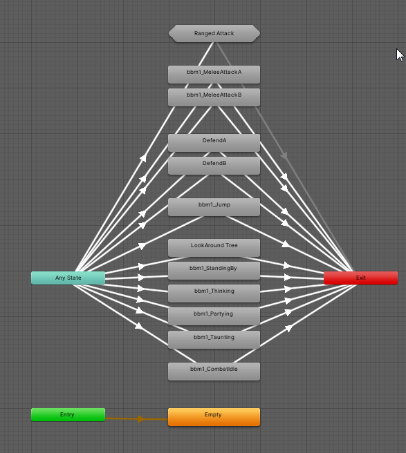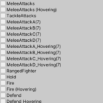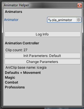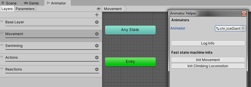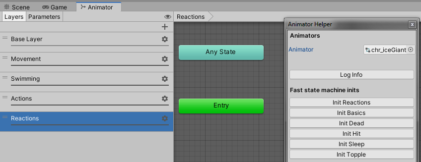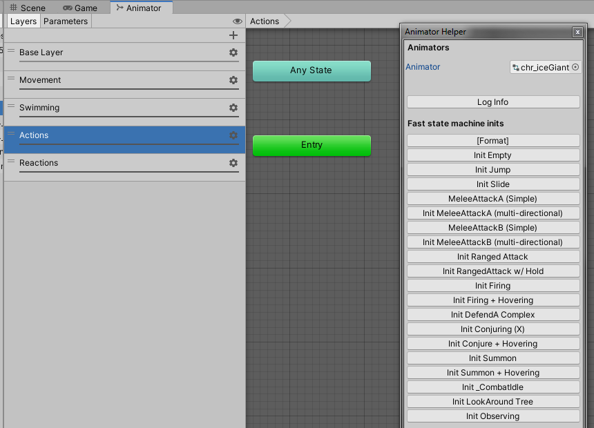 - Initialize layers with wanted animation states, based on existing animation clips – one click per state, e.g. “MeleeAttackA”