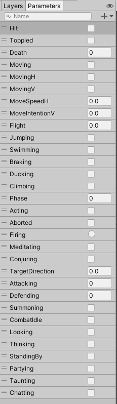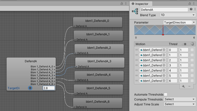 Throughout this process, naming conventions have to be respected. For example, I decided to add model-specific prefixes to the animation clips, or numeric suffixes that indicate the animation’s target direction. And of course, spelling and types of the parameters must be uniform to guarantee that the animations are properly triggered.