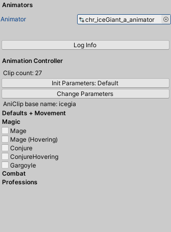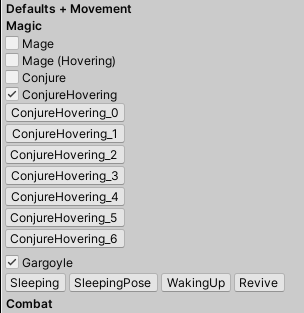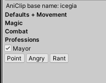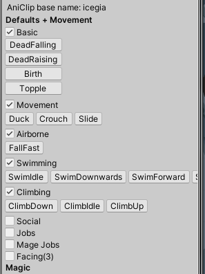 The options, that are grouped by categories, are traversed and presented only, if the related animation clip is not found. The method CheckClipName(clipName) draws the button for the clip only then, if the animation clip does not exist yet. An optional delegate ProcessAnimationClip can be specified to post-process the so created animation clip. I used that for poses, as you could see with the “Conjure” name groups above, where I passed the method CheckAniClip_MakePose, which internally slightly changes the AnimationClipSettings.