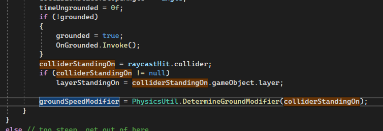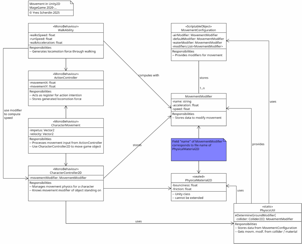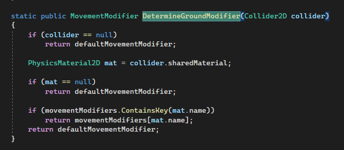 The movement modifier is retrieved from a register of movement modifiers with the help of the physical material the character is standing on. It was not possible to enrich PhysicMaterial2D by the desired movement values, since PhysicMaterial2D is sealed. That requires then a parallel data table, and as key to connect between both types of data (PhysicsMaterial2D and MovementModifier) we simply use the name of PhysicsMaterial2D, which it has, since it extends UnityEngine.Object.