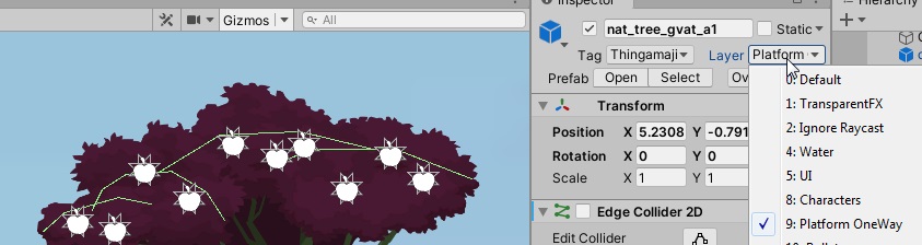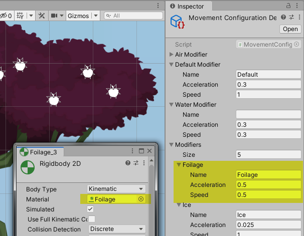 The physical material of the edge colliders in a foilage object is set to the PhysicMaterial2D named “Foilage”. That name corresponds to an entry in the global movement configuration. That is a configuration which enhances the PhysicalMaterial by qualities for movement. Currently, this only includes acceleration and speed modifiers for walking on these materials.