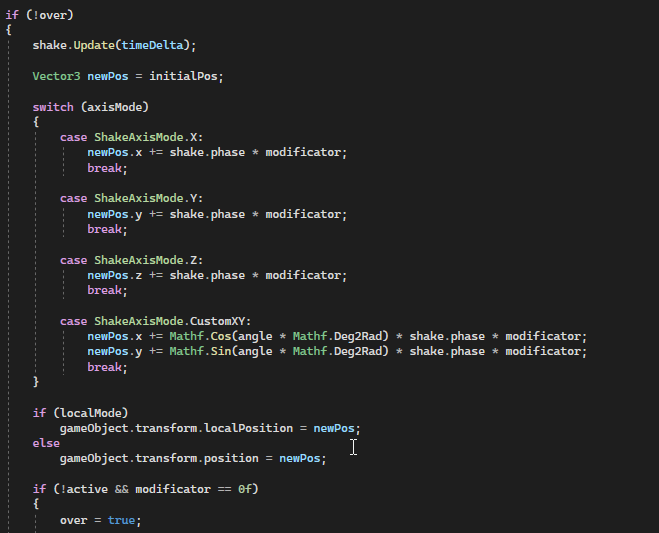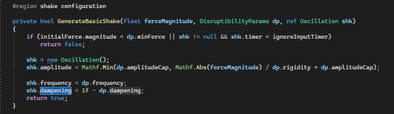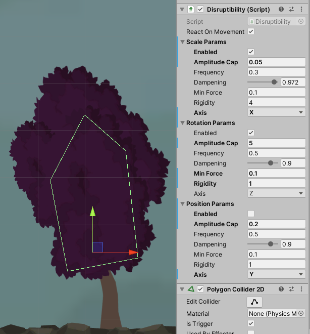 One can distinctly toggle which transform shall be affected by physical force: position, rotation and scale. The affected axis as well; available are X, Y and Z. The configuration of the shake effect is fine-grained. The rigidity in each regard determines how intense the effect amplitude will be, and a limit to the oscillation amplitude can be specified with the amplitude cap value. Sensory input is provided by adding a 2D collider with the isTrigger flag checked.