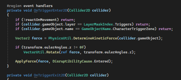 Trigger event methods on the behaviour register and process movement from passing colliders. Axis-specific forces are computed from the by-passing movement force.