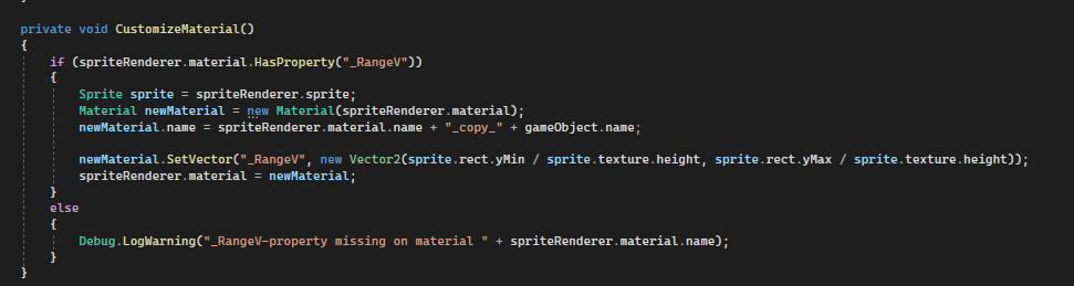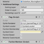 The Flag behaviour will analyze the material of the spriteRenderer, which has the banner fabric graphic linked, and if it finds that has the proper shader property “_RangeV”, it will copy the material and initialize that property with the required data from the linked sprite. The rest of the properties needs no customization.