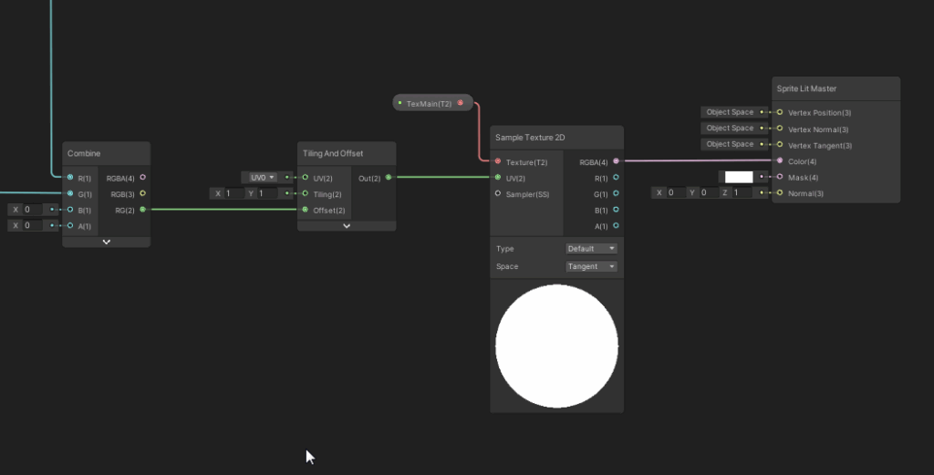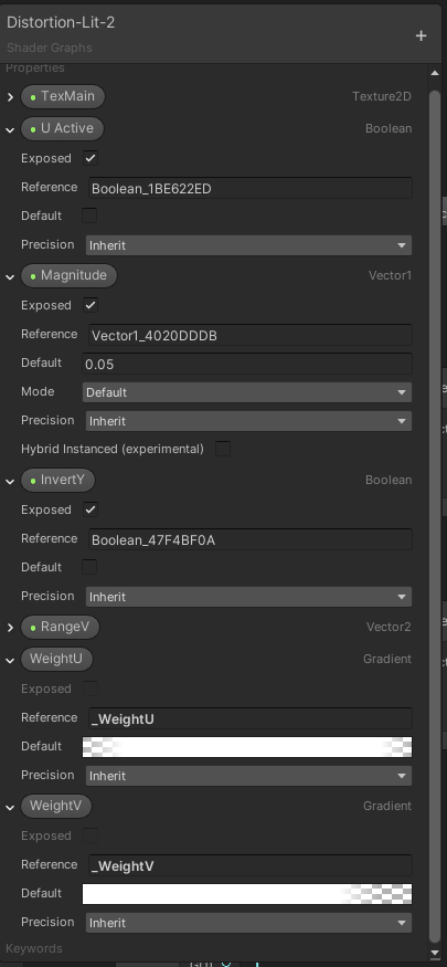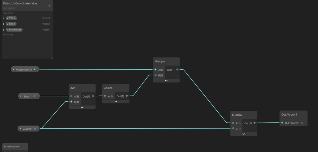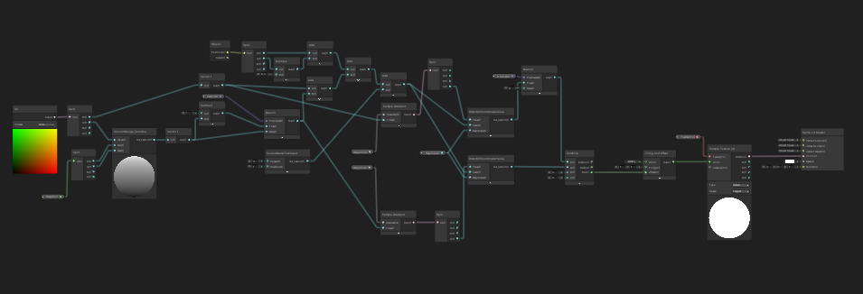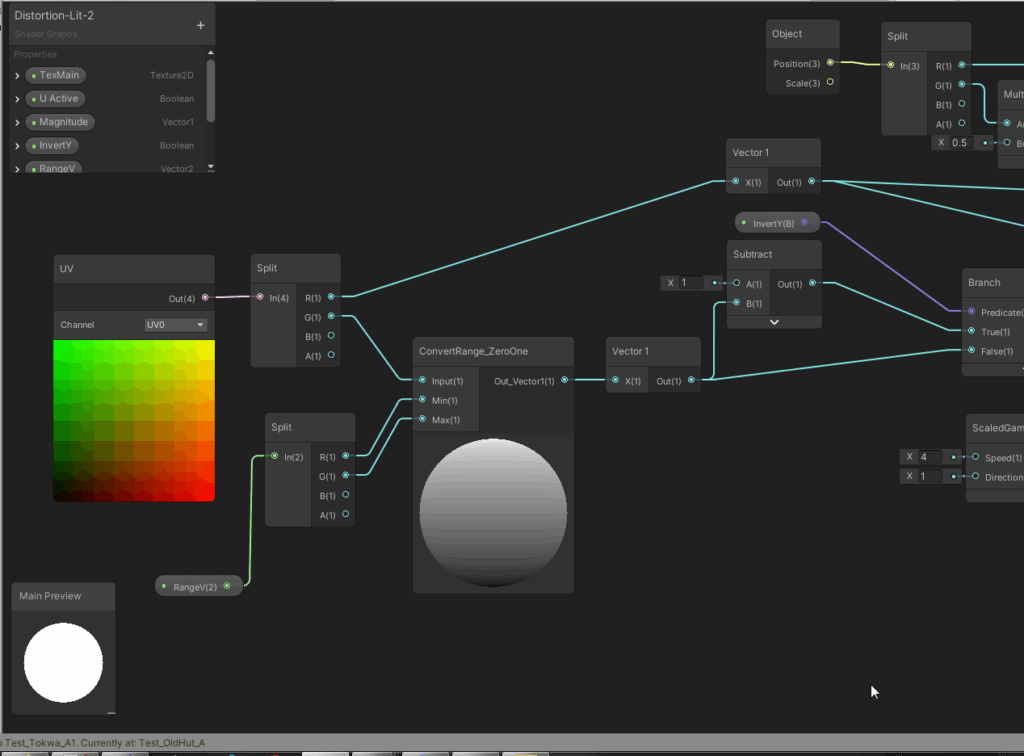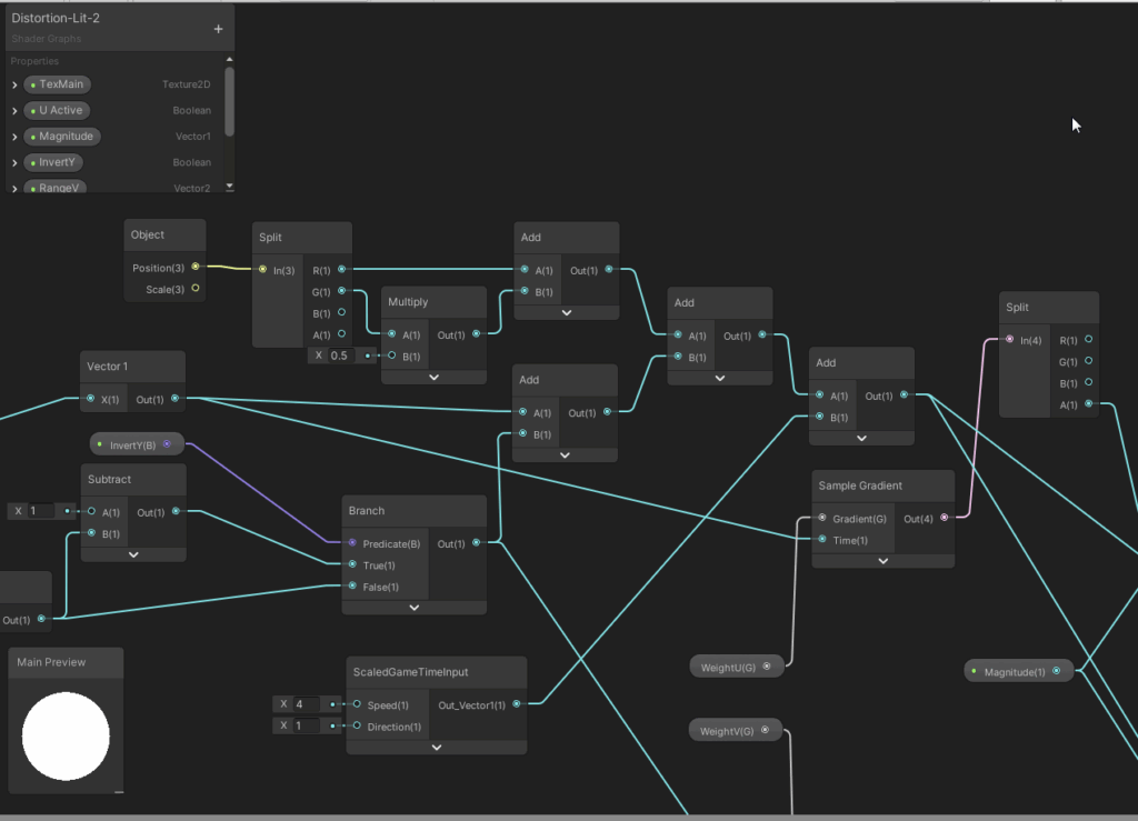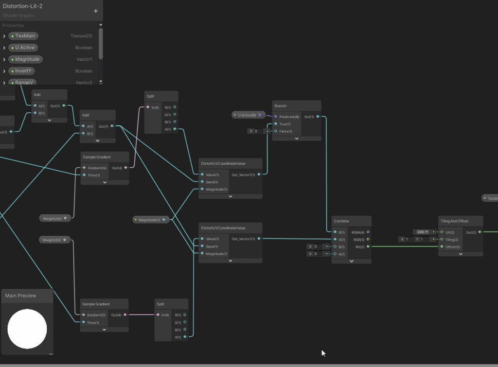 The next graphics show the full main shader graph. We dive into the details afterwards. It might be a good idea to at first take a look at the shader properties, then starting from the end of the graph and reading to the left until we reach the start to understand which values are influencing the final outcome. While I revised the graph for this article, I found out that the computation of the U value offset would not work – I mean about 4 nodes in the mid top section of the graph. Luckily, the U offset was not needed to create the waving effect. The computation of the V offset however is absolutely cruicial for this shader to work.