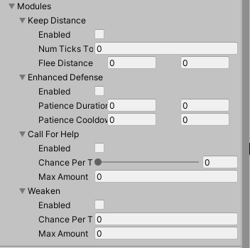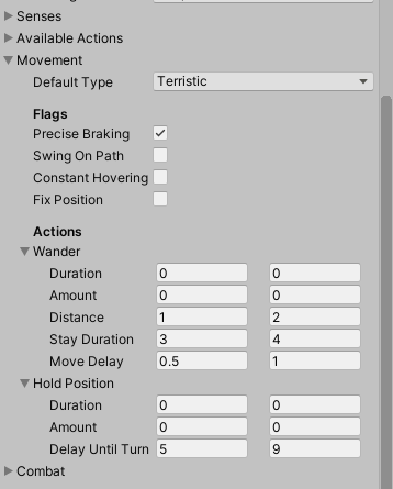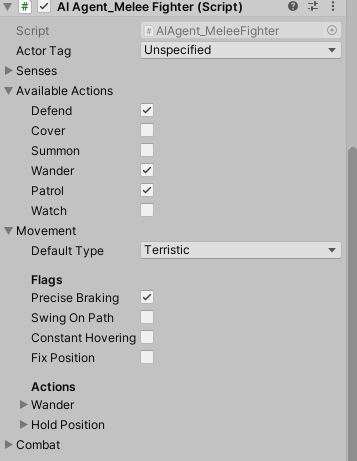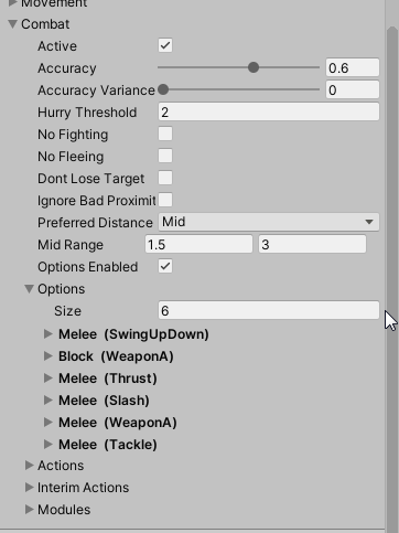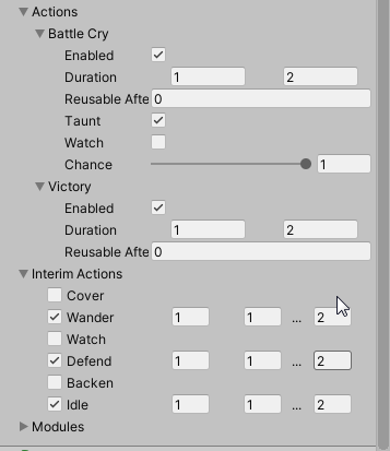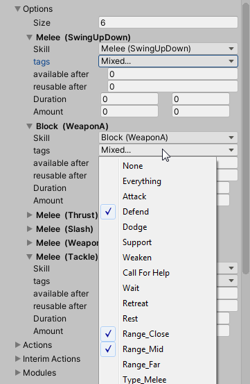 The choice of the actions can be parametrized via editor. Simple actions and specific behaviour modules can be de-/activated. The combat action options can be configured with timing information, and in some cases additional data like probability and availability depending on range to a potential target.