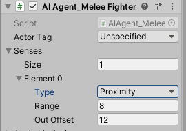 In order to perceive their environment, AI agents would have sensors, which I simply called perception. The easiest perception type is the proximity perception – a simple check of distance. In the editor, it would be configurable as such: